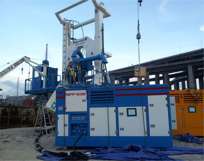 講座最后,景安重工董事長陳衛(wèi)先生對景安JRD(氣舉反循環(huán))鉆機及其聯(lián)合全回轉施工工藝進行了詳細介紹與講解。他指出,JRD反循環(huán)鉆機是一套以全液壓控制的嵌巖鉆機,利用液壓旋轉動力頭提供足夠的扭矩及旋轉速度,再加上鉆具自重及加壓液壓油缸的下壓力,通過鉆頭上滾刀對巖面進行位移與壓破,從而達到嵌巖的效果。該鉆機及相關工法已在福建、香港、澳門等地區(qū)的重點工程中“大顯身手”,為復雜地層的嵌巖施工提供了極佳的方案,獲得合作方一致好評。
