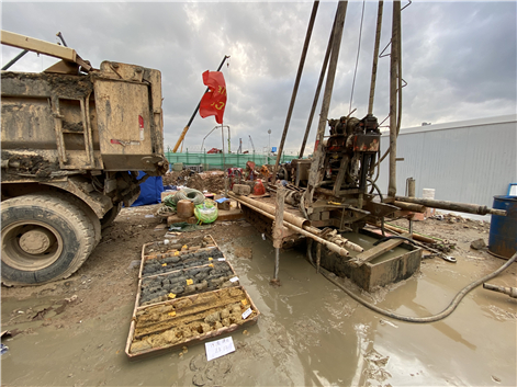 3月6日,臨時棧橋正式通車,勘察團(tuán)隊(duì)與眾多施工隊(duì)伍一同入場,并在當(dāng)天晚上就提供了現(xiàn)場施工緊急需要的地質(zhì)柱狀圖及剖面圖。由于現(xiàn)場參建單位眾多,作業(yè)面有限,工人們只能開展交叉作業(yè),在泥土松軟的場地上不斷搬動鉆機(jī),調(diào)整作業(yè)地點(diǎn)。